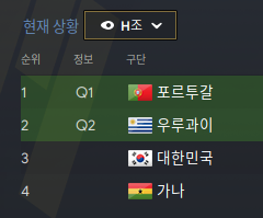 22.12.03 월드컵 대한민국 1승 2패 , 가나는 2:0 승, 나머지는 모두 패했다. 16강 진출 실패!! (가상입니다.)