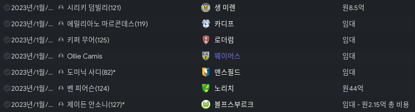영입에 이어 방출선수. 잉글랜드는 25인 선수단 등록 및 21세 미만은 등록없이 운용이 가능한데 21세 이상은 무조건 등록이 되어야 경기를 뛸 수가 있다. 어쩔 수 없이 능력치도 안되거니와 임대 또는 이적해달라는 애들 위주로 방출시켰다. 임대도 완전이적액이 포함된 임대이다.