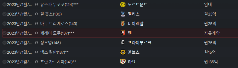 정우영 140 대 능력치지만 연봉을 높게 책정해서 데려왔다. 프라이부르크가 불쌍해서 6개월 할부로 75억을 넣어놨다. 그런데 너무 돈을 밟힌다. 나중에 재계약할 때 후려쳐야 겠다.