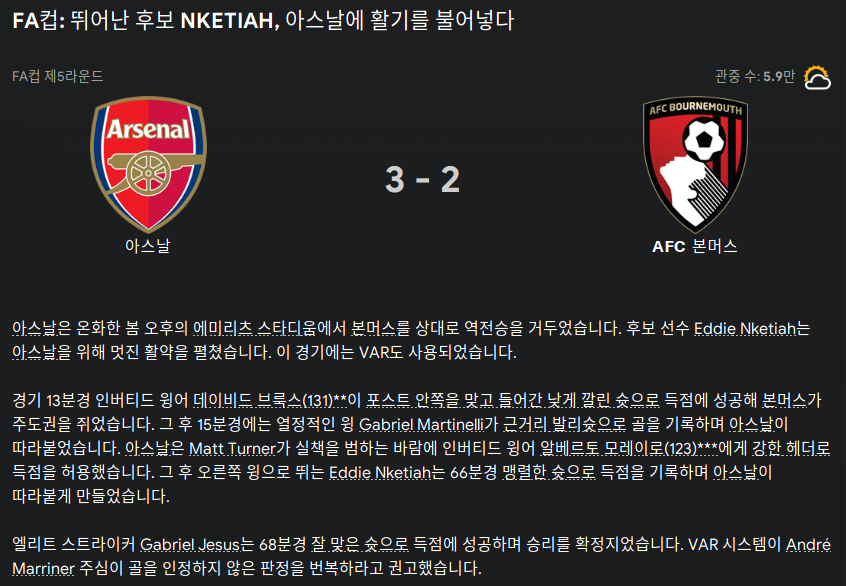 그다음 경기로 FA컵에서 아스날을 만나, 3:2로 패했다.
