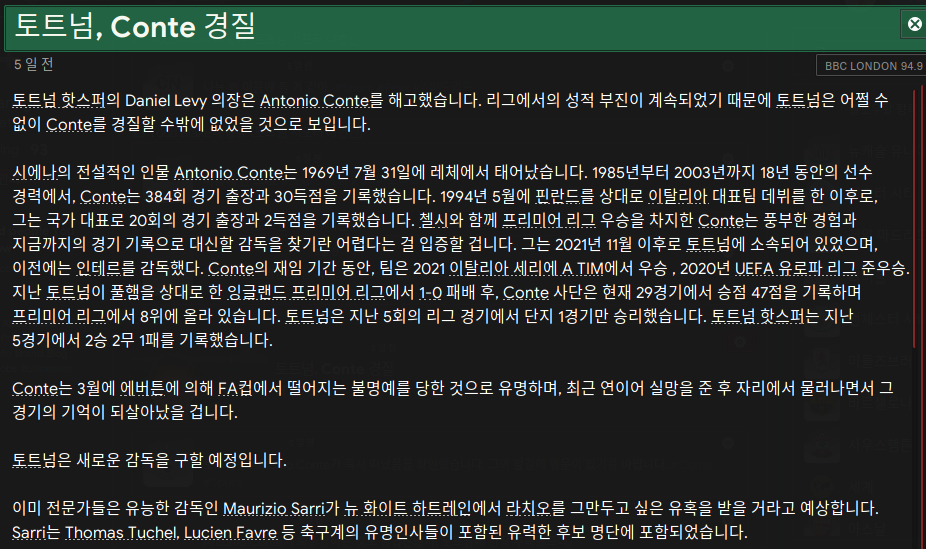토트넘 새감독은 월드컵에서 좌절을 맛본 전 스페인 감독 루이스 엔리케로 낙점. 엔리케가 취임하기 직전 울브스와 5:1완파 당했는데 들어오고 나서 다시 기량회복하여 우리팀 본머스와 1:1 무승부를 이뤘다.