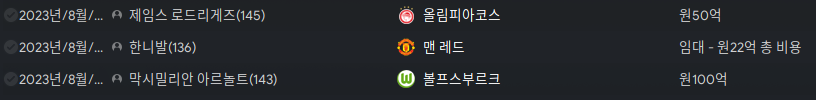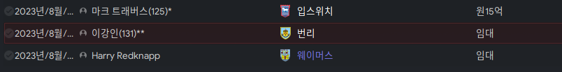 트래버스는 자기가 후보임에도 징징거려서 적은 가격에 팔아버렸다. 이강인은 25인이 넘어버려서 아직까지 크지 않아 챔피언쉽에서 주전으로 뛰라고 넘겼다.