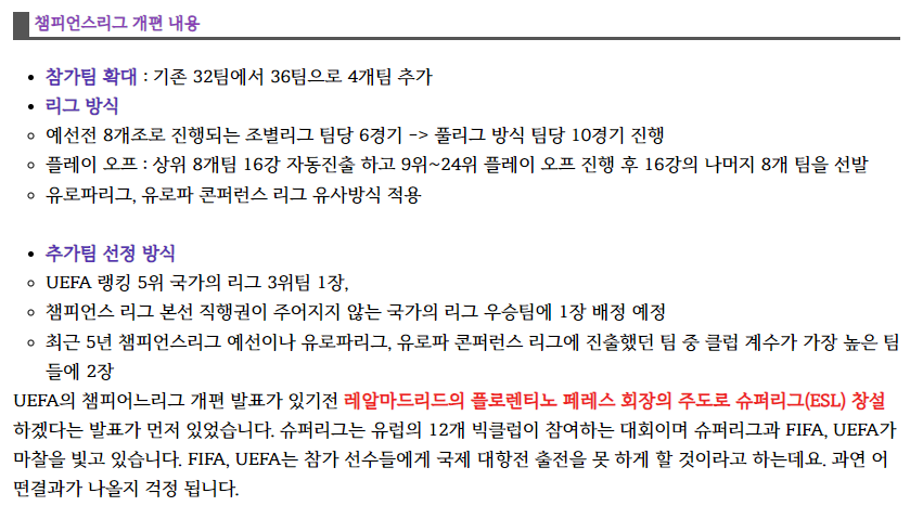 UEFA 24-25 시즌 챔피언스리그 개편안 발표