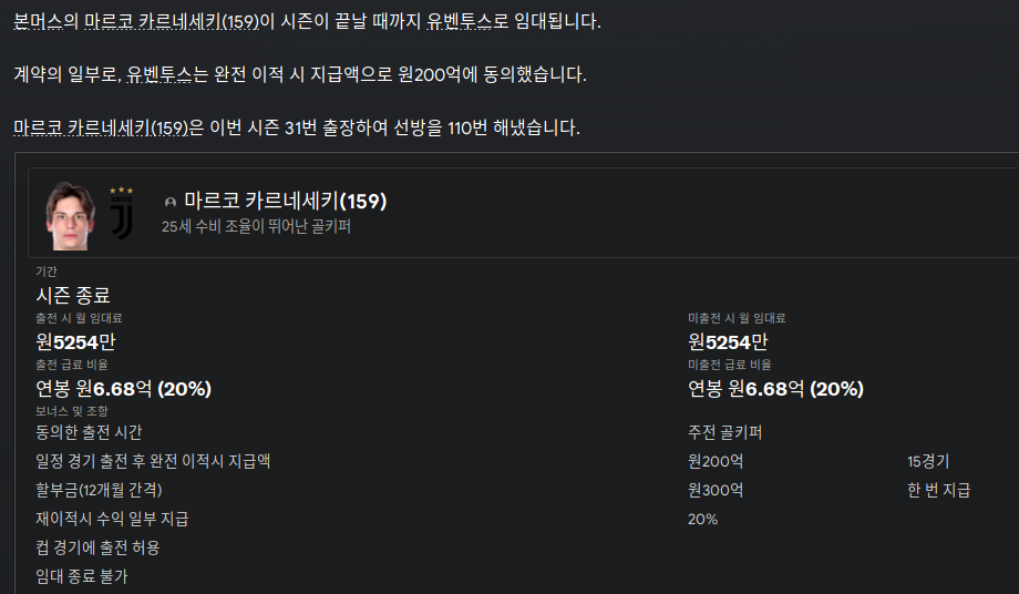 주전 골키퍼의 부진으로 2025년 말 리그 및 챔피언스 리그 경기에서 패배가 많아서 탄데가 어느정도 클때까지 이 녀석으로 버티기가 힘들 것 같아서 팔기로 결정했다.