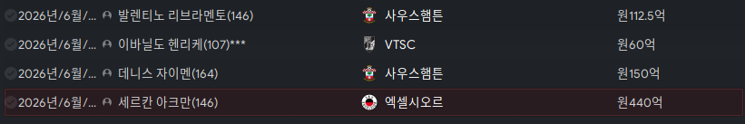 세르칸 아크만은 네덜란드 리그의 엑셀시오르에서 뛰던 선수가 스카우트에서 발견된 케이스인데 방출 최소 금액 그대로 데려왔다. 그때는 헤리케인을 영입할 생각이 없었기에 쾌척했는데 영입했더니 바로 불만 떠버렸다. (약속 같은 거 안해보려고 한건데.. )