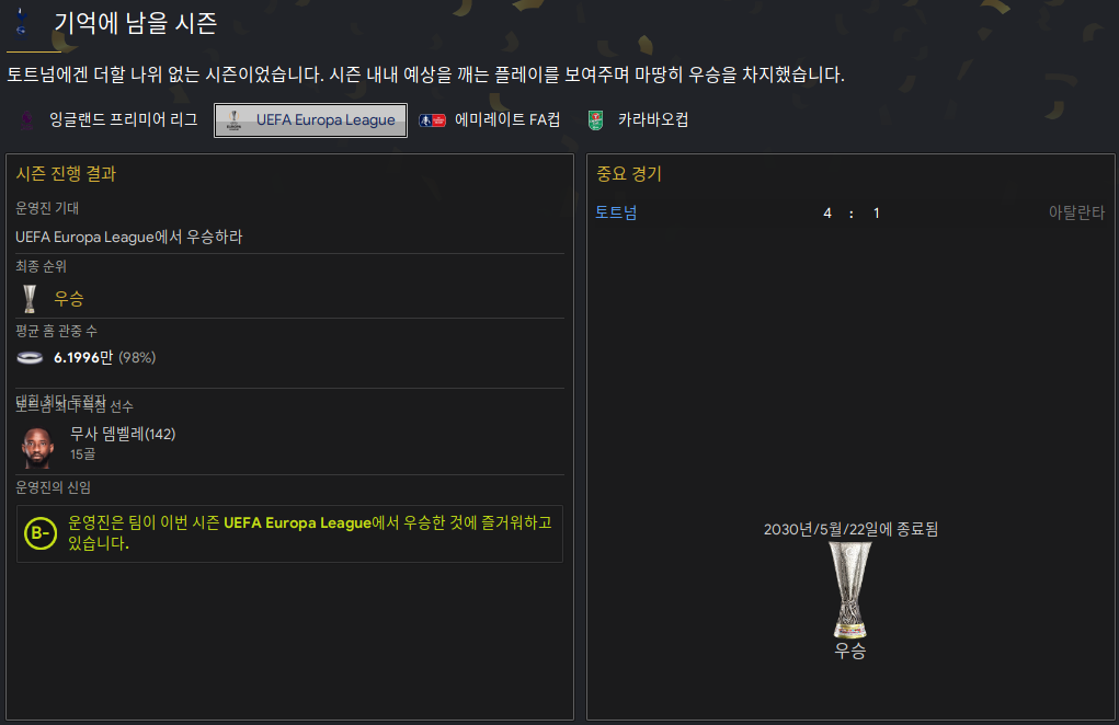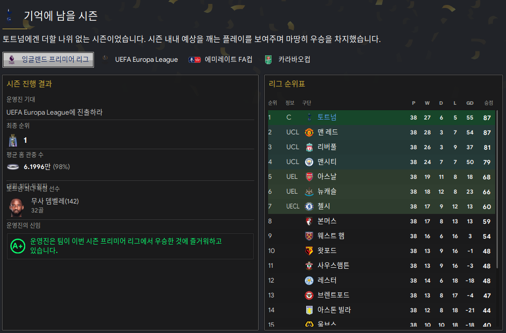 | FM2023 축구감독 생존기 (토트넘편) #30/31시즌 (1) | 2023.01.09 |