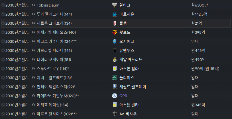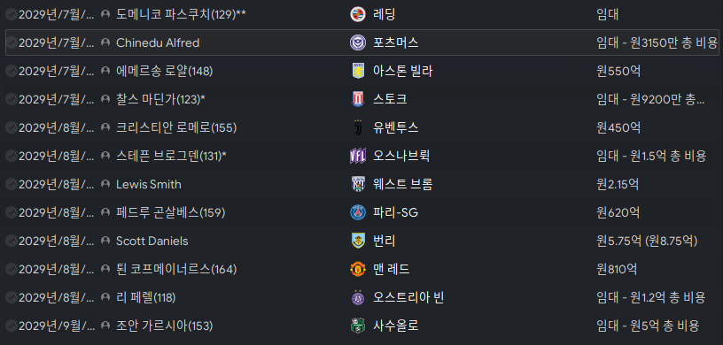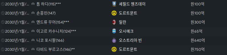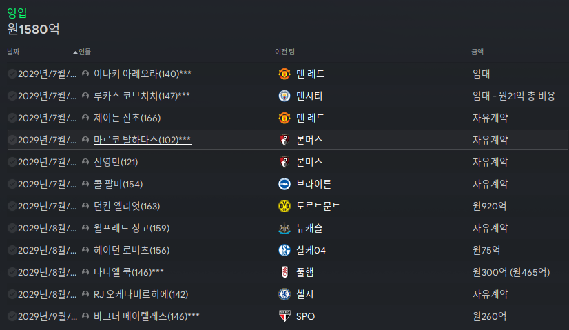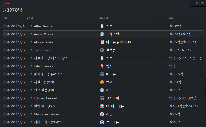 현생에서 히샬리숑과 클루셉스키를 제외하고 다 물갈이 됐다. 2군 선수에 좀 더 많이 남았으나, 현재 주전선수들이 챔피언스 리그 나가고 싶다고 이적을 요청한 선수들이 많다. 본머스, 도르트문드에서 땡기지 않으려 했는데 아무래도 안될 것 같다. 방출 리뷰가 기대되네.. T_T 더 큰 문제는 영국선수들이 많이 없다는 것. 왜 그리 외국선수들만 영입을 해놨는지 골키퍼도 고만고만 한 녀석들 3명이 140~150사이다.