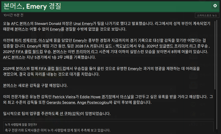 본머스 계속 시즌 중위권 유지로 경질이 됐다.