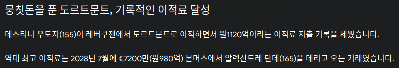 7월 1일이다. 레비야 이적시장을 돌볼 시간은 줘야 되는거 아니냐? 도르트문트에서는 왼쪽 풀백이 약하다고 해서 레버쿠젠에서 뛰고 있던 우도지를 데려왔다. 그것도 최소 방출조약금액이 1020억에....