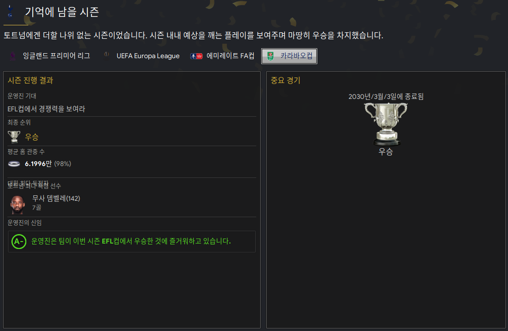 카라바오컵 연승 중이다. 이번년도까지 3년 연속인 듯 하다.
