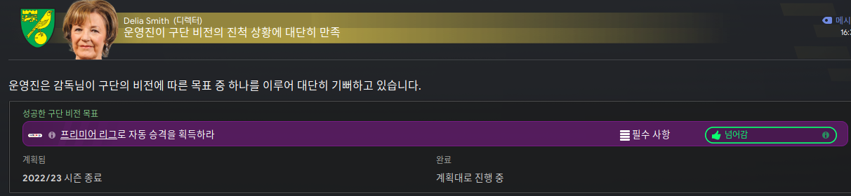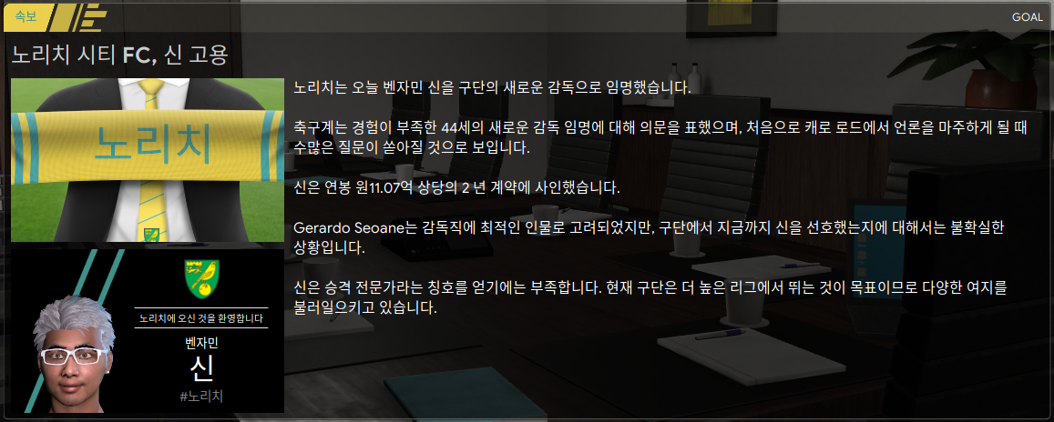 기존 게임과 같이 현재 로스터에서 감독이 없는 팀만 선택이 가능하도록 시작을 했고, 잉글랜드에서 할 수 있는 팀이 노리치 밖에 없었네요. 언제나 스트레스 없는 게임을 위해서 FMRTE를 사용 중이며, 가급적 이적/계약 버그는 자제하도록 하겠습니다. (이적시장에서 한번 만 허용)