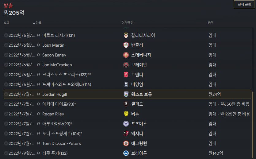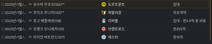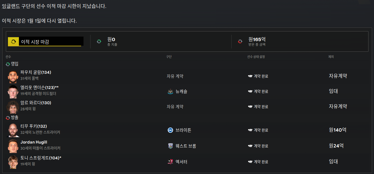 - 티무 푸키: 마지막 날 브라이튼 아니면 안나간다더니 오퍼가 왔다. 75억에 가져간다는 걸 140억으로 올렸는데 바로 승락해버렸다. 판매되자마자 팀 선수들이 들고 일어나 원치 않은 회의까지 하며 불만이 터져나오는 것을 제대로 된 선수를 영입하지 않으면 폭발할테야를 시전했다. 썩을 넘들... 그래서 급하게 찾은 다행히 130대 임대생을 영입했다.