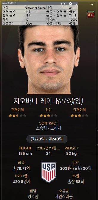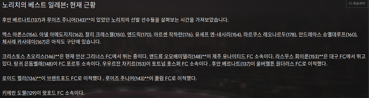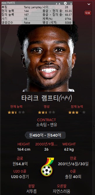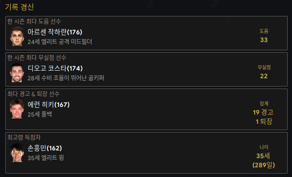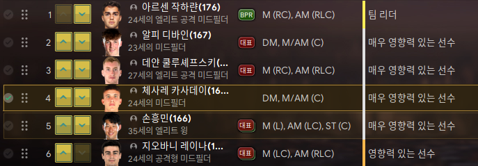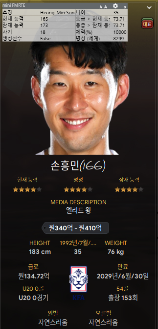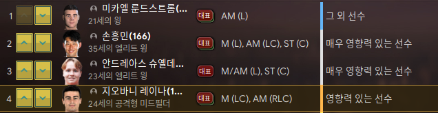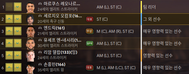 1. 손흥민 - 리그 중에 몸값이 싸져서 얼른 데려왔다. 35세. 아직 타고난 체력이 16이다. 1~2년은 써먹을 수 있겠지? 여전히 국가대표 손흥민