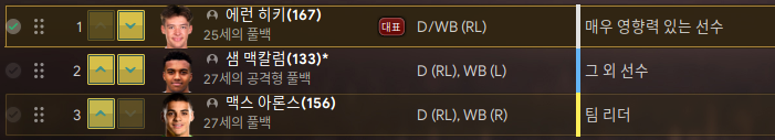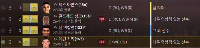 에런 히키가 주전, 샘 맥칼럼이 후보다. 맥스 아론스는 우측풀백 플래툰 주전이다. 좌측 풀백이 2명밖에 안되기 때문에 가끔 아론스가 뛰기도 할 예정