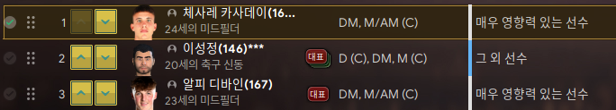 카사데이가 주전, 이성정은 후보 및 컵용 주전으로 뛴다. 디바인은 AMC 후보