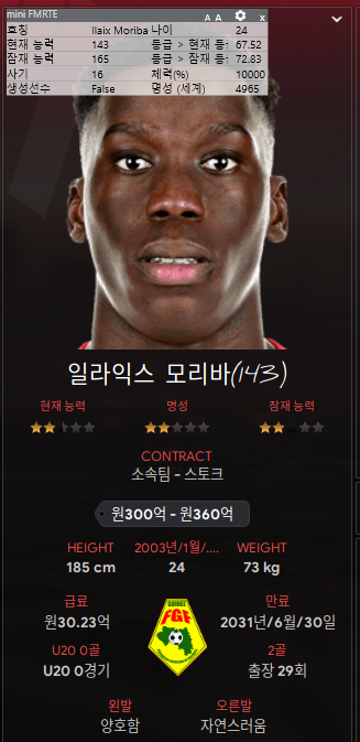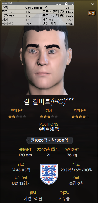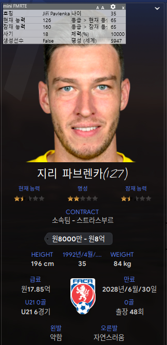 8. 지리 파브렌카 - 후보 골키퍼. 잘 크기도 않은 유망주 골키퍼 임대보냈더니 130가까이 컸네. 이제 이 녀석으로 후보 세워야겠다. 너는 방출!!