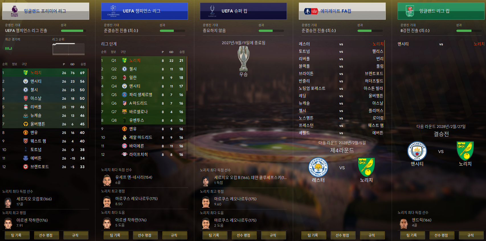 모든 리그컵 잔존. 리그 및 챔피언스 리그 1위 중. 전년도 리그 우승팀인 맨유가 버벅이고 있다. 역시 나이가 들어가는 선수를 유망주로 제때 바꾸지 못한 팀의 결과일 뿐..