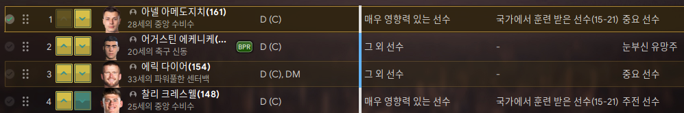 아메도지치와 에케니케를 주전으로 다이어와 크레스웰이 후보 또는 플래툰으로 뛸 예정이다. 에케니케를 적어도 160이상으로 만들어놔야 한다.