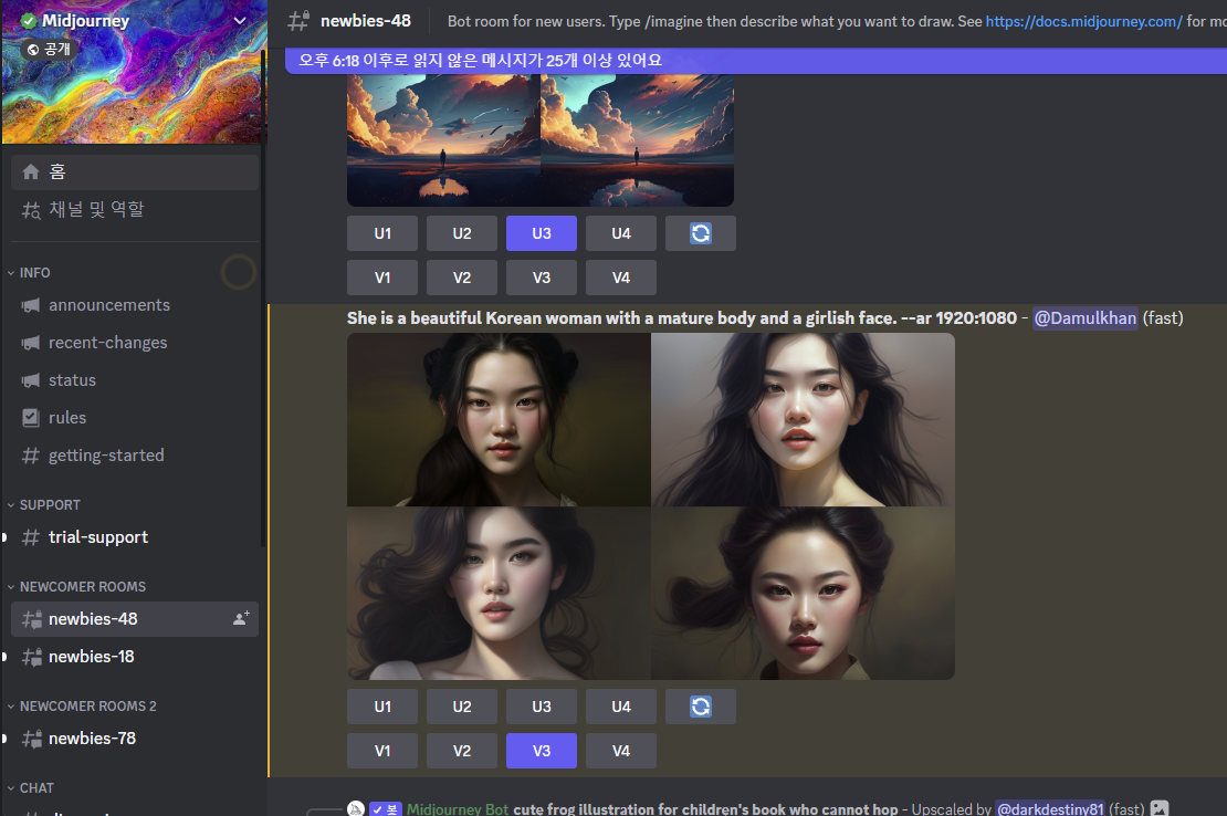 MidJouney에 디스코드 채널에서는 다른 사람들이 실시간으로 생성요청을 하는데 그것을 보고 참고해도 좋을 것 같다.