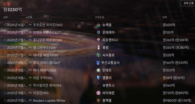 1. 우우르잔 차키르(Ugurcan Cakir; GK; 160/160) - 주전급 GK가 2명인지라 방출.; 터키 선수