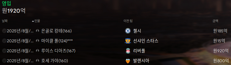 선수는 별로 영입하지 않았지만 4명의 영입금액이 3300억에 육박해서 EPL 최고 영입금액을 자랑했다.