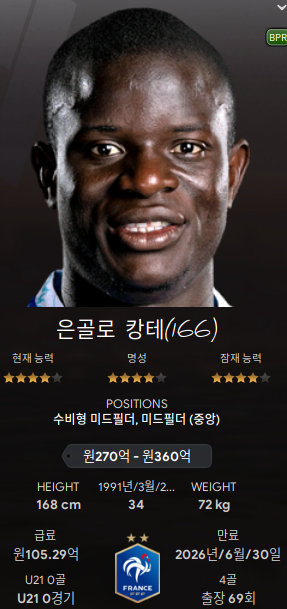 3. 은골로 캉테(N'Golo Kante; DMC/MC) - 나이가 많아서인지 싸게 내놨길래 얼른 데려왔다. 1~2년 정도는 써야 할텐데.. 벌써 능력치 1이 떨어졌다.