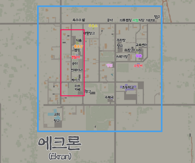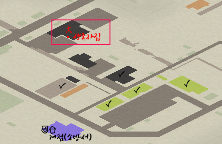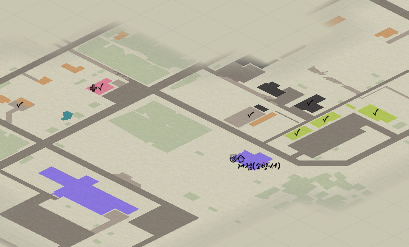 내가 만드는 지도... 초록색은 상점들이다 다 털었으니 체크.. 분홍색은 병원. 병실이 있는 병원은 아니다.