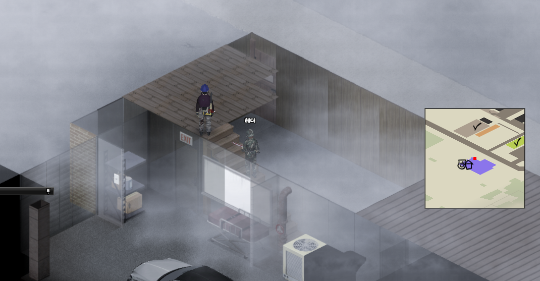 지도에서 북쪽에 검정(공장)지역 쪽을 갔다가 생존자를 발견했다. 아쉽게도 적대세력.. 최초로 사람을 죽였다. 어쩔 수 없지 안그러면 내가 사망이니까... 여기도 대단한 자동차 공업소 같은 곳이었는데 대형망치는 없었다.