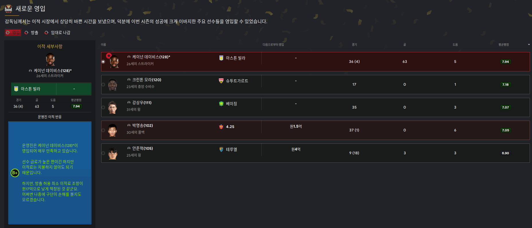 잉글랜드 아스톤 빌라에서 나가리됐길래 영입할 때 17억 바이아웃으로 계약했는데 .. 과연..