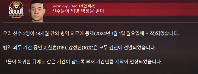 그나마 조영욱을 비롯해 제대하는 친구들이 있긴하다. (엇. 다시보니 2024년 말에 오네. 썩을)