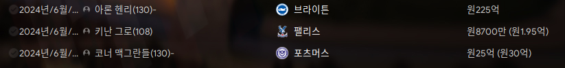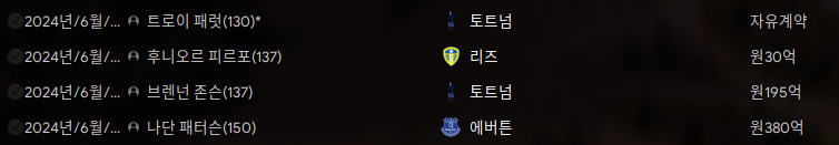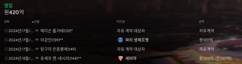 위는 시즌 시작 전이라 이전 시즌에서 영입한 것으로 나와서 따로 되어 있지만 대략 둘이 합쳐 1000억원에 육박하는 영입액이다.