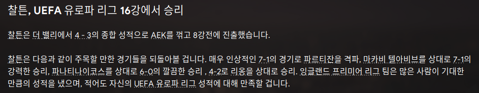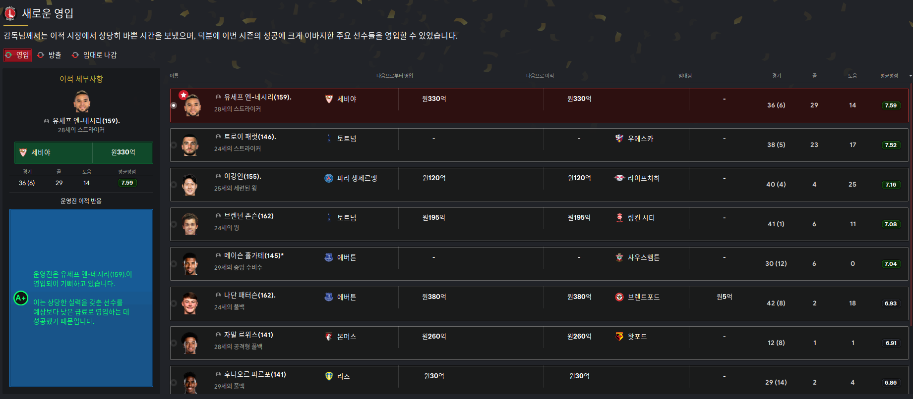 겨울이적 시장이 다가왔다. 다행히 초반 패배가 많았지만 선수들이 전술에 잘 녹아들면서 몇몇 큰경기도 승리도 하고 리그 순위도 중상에 위치해있다. 게다가 유로파 리그는 연승 중이다. 아직 큰 팀과 만나지는 않았다.