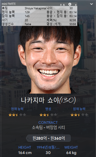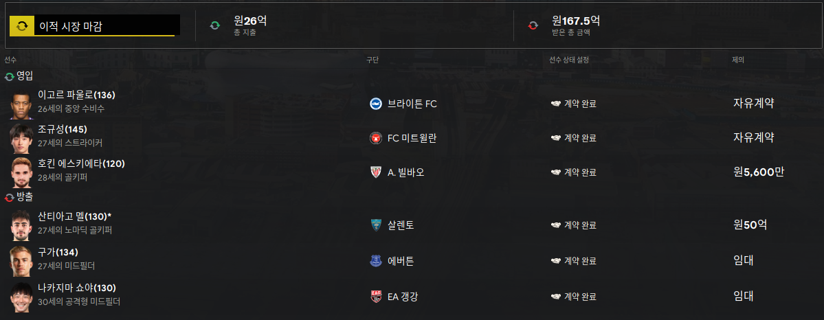 일본선수 하나 내보내고 또 한명 데려왔다. 일본리그가 추가가 된 덕분인지 일본 선수들이 준수한 능력치로 많이 풀렸다.