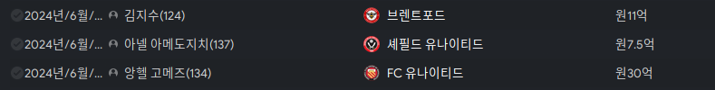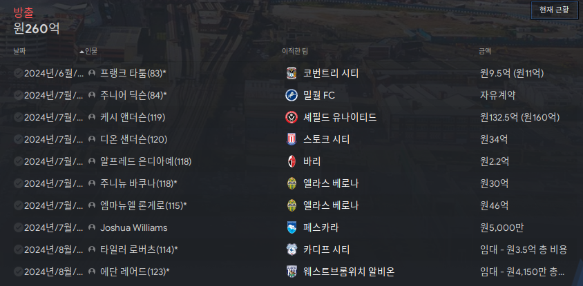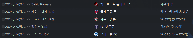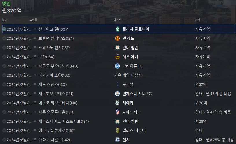 주요 이적상황. 300억정도 남았는데 급료예산이 초과되서 더 영입을 하지 못하는 상황이다.