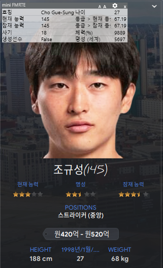 조규성은 자유계약으로 써있지만 80억에 영입했다. 나중에 나가는 돈... 어쨋든 버그영입이긴 하다. 공격수로 계속(과연?) 쓸 예정이다. 오현규도 영입할라다가 급료예산 때문에 포기.