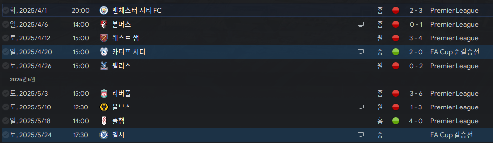 우리팀은 막판에 미친듯이 패배를 거듭하여 9위까지 내려앉았다. 마지막 게임은 선수단 미팅을 통해 격려 한번 해주니 다시 살아올랐다. FA컵 결승도 미쳐보자. 우리가 이기면 유로파, 첼시가 이기면 뉴캐슬이 유로파에 갈 것 같다.