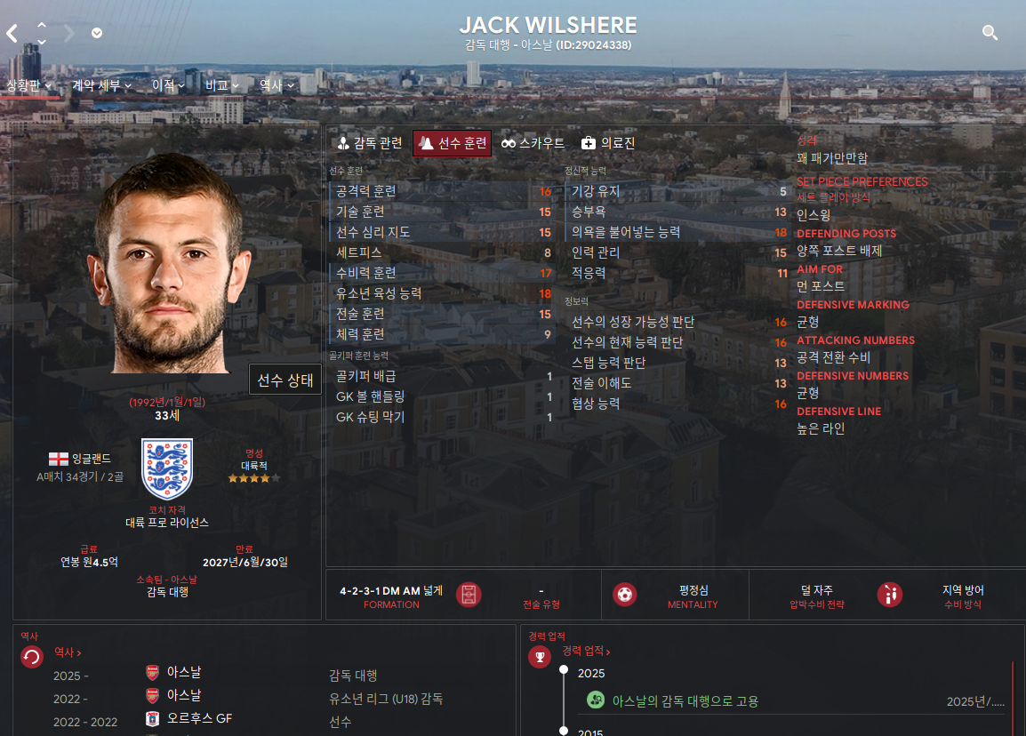 아스날 감독 아르에타 잘리고 대행하고 있는 잭 윌셔(33세)의 스탭 능력치가 ㅎㄷㄷ.. 그냥 감독해도 될 듯