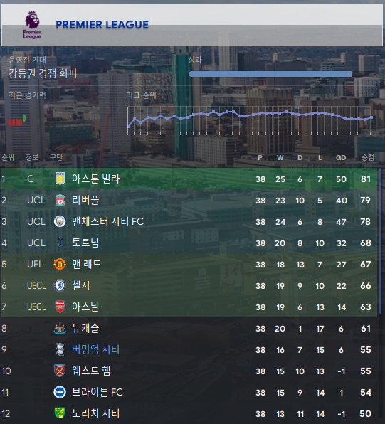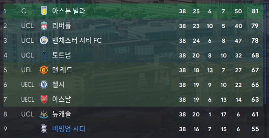 시즌종료. 미친 아스톤빌라가 1위를 거머쥐었다.