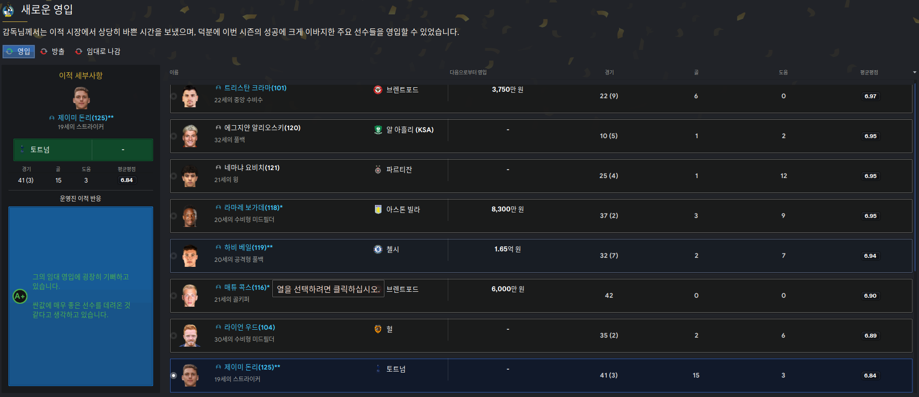 다만 공격수가 많이 없는 상황이라 토트넘 유망주 한명을 임대했다.