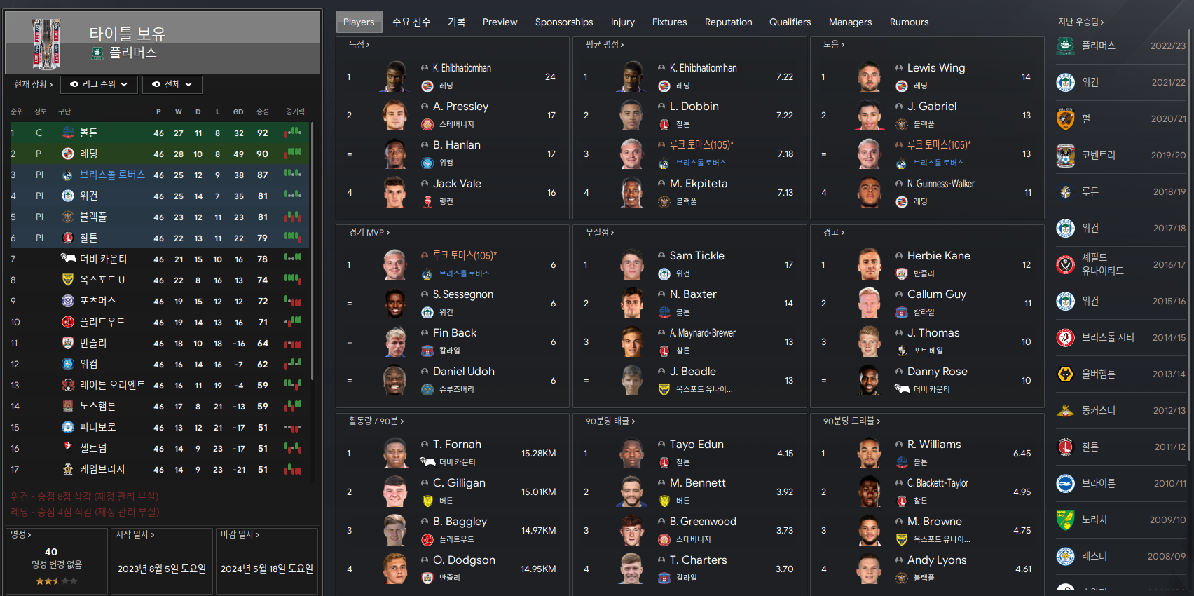 최종 3위로 플레이오프를 통해 승급여부가 결정되게 됐다. 레딩과 위건은 감점 10점이 됐음에도 상위권을 점유했으니 아마 감점이 되지 않았다면 볼턴이 플레이오프에서 또 떨어지지 않았을까? 이청룡이 뛰었던 볼턴은 매 게임때마다 플레이오프에서 승급을 하지 못하는 팀이었으니까...