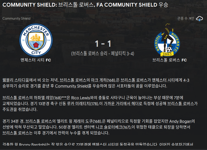 드디어 커뮤니티 쉴드 정복!! 맨시티 골키퍼 였던 에데르송을 골키퍼로 세우고 이겨냈다.
