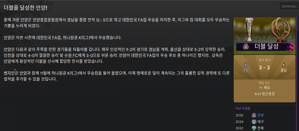 | 축구감독 생존기 S4 - 안양FC 26 > 토트넘 25/26 (0) | 2024.01.14 |