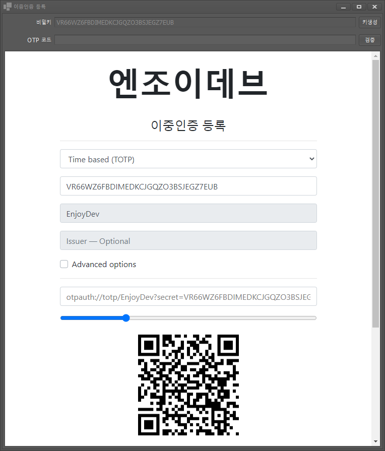 실행하면 이런 느낌으로 개발해봤다. "키생성"버튼으로 키를 랜덤생성하고 아래 "Secret -Required" 란에 클립보드에 복사된 키를 붙여넣으면 QR코드가 완성이 된다.