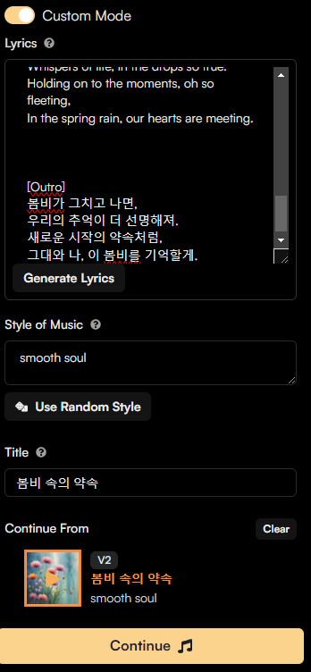 이 때 중요한 것이 전체 가사를 넣어버리면 지멋대로 반복하고 난리나기 때문에 끊어진 위치 이전 가사는 모두 제거한 후, "Continue"버튼을 클릭하자.