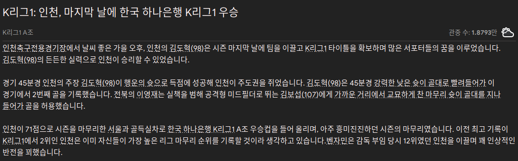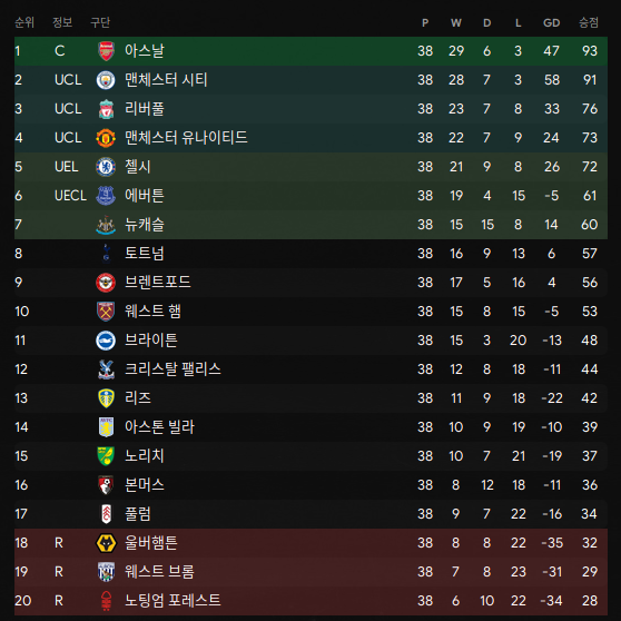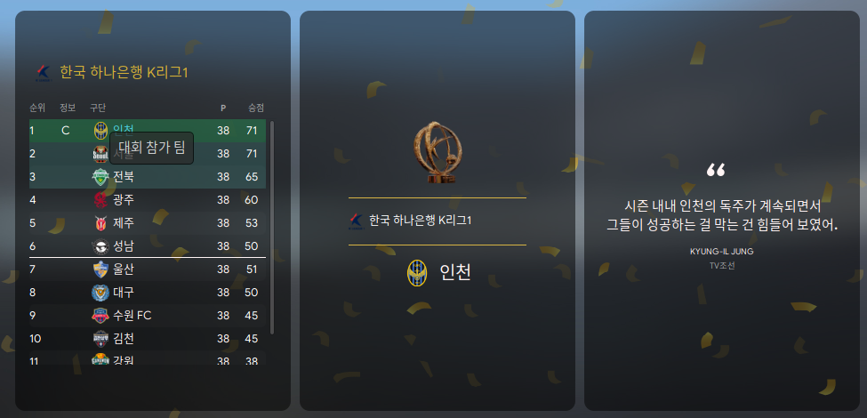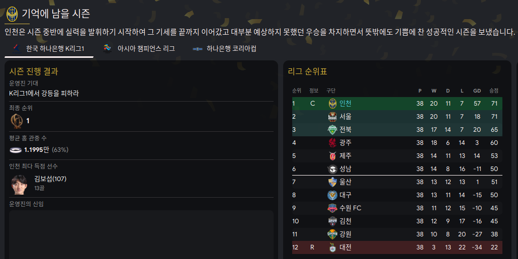 2년 전 인천도 이랬던 것 같은데... 24위라뉘... 프리미어 리그로 승급이 가능할지 모르겠다.