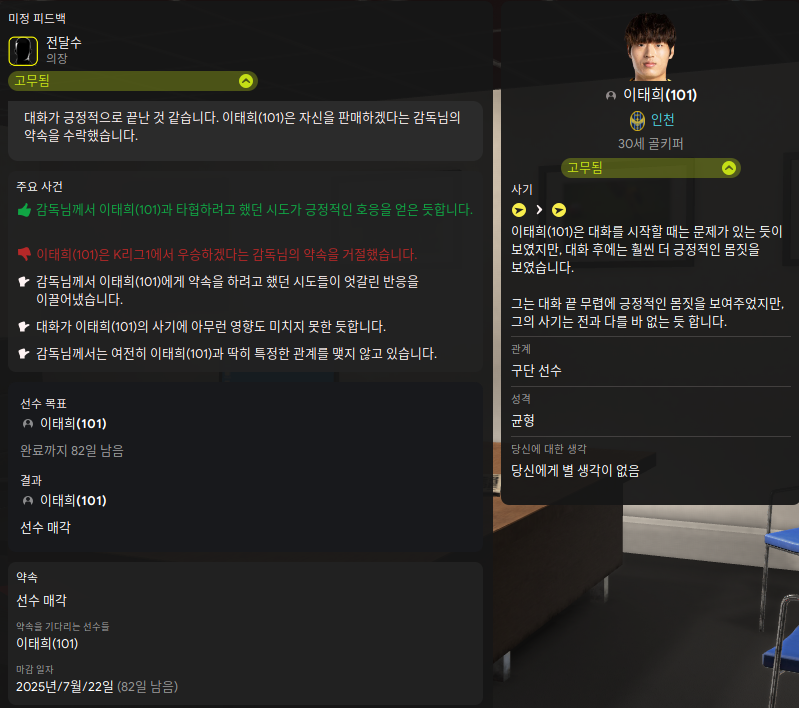 선수단 및 스태프 정리하고 보니 주전 골키퍼가 떠나고 싶단다.