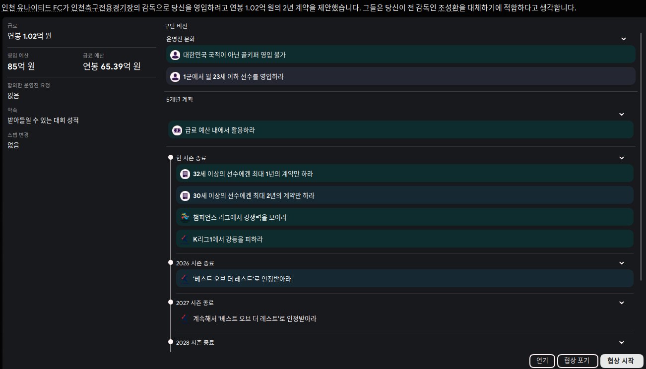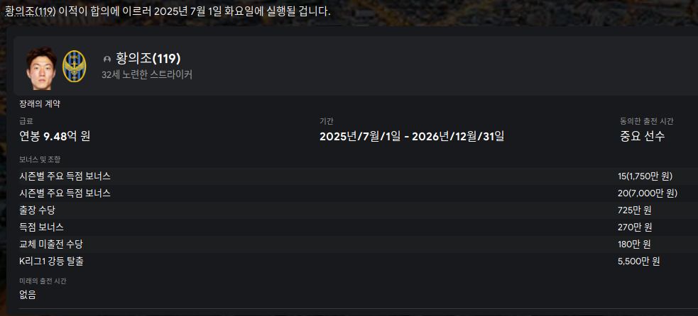 인천이 계속 계약을 걸기는 했는데 26년 말에 넘어갈 것이기 때문에 챔피언스 우승 보너스 상금 2천만원을 부득불 넣었더니 계속 파토내는게 아니던가? 내가 몇백억을 벌어다줬는데... 3번 파토 낸것으로 기억하는데 난 간다. 빠빠이...