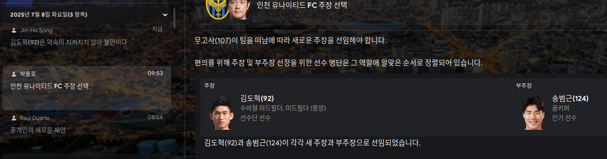 주장인 무고사가 떠났고, 부주장이었던 김도혁을 주장으로 승격을 했건만 약속이 지켜지지 않아 불만이란다.