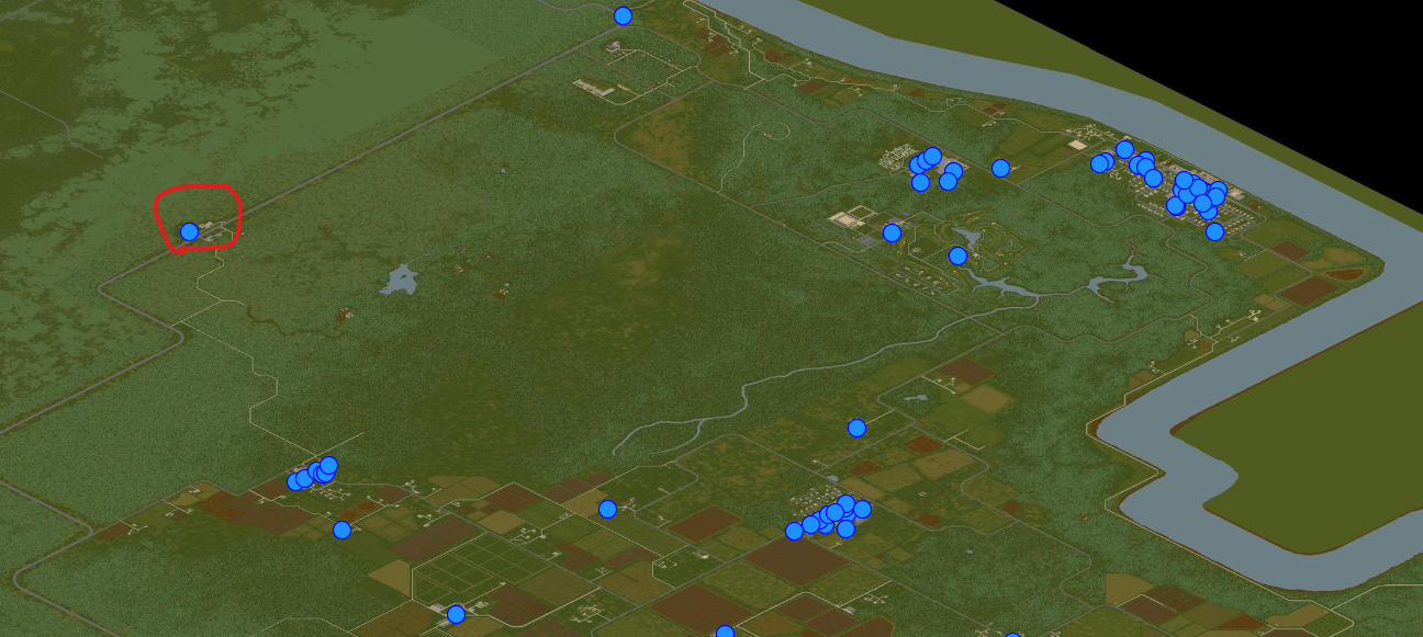 우측 상단 파란 동그라미가 많은 곳이 리버사이드다. 거기서 더 서쪽 거의 끝이라고 보면 된다. 물론 더 서쪽에 뭔가가 있긴 한데 바로 갈 수 있는 도로도 없다.