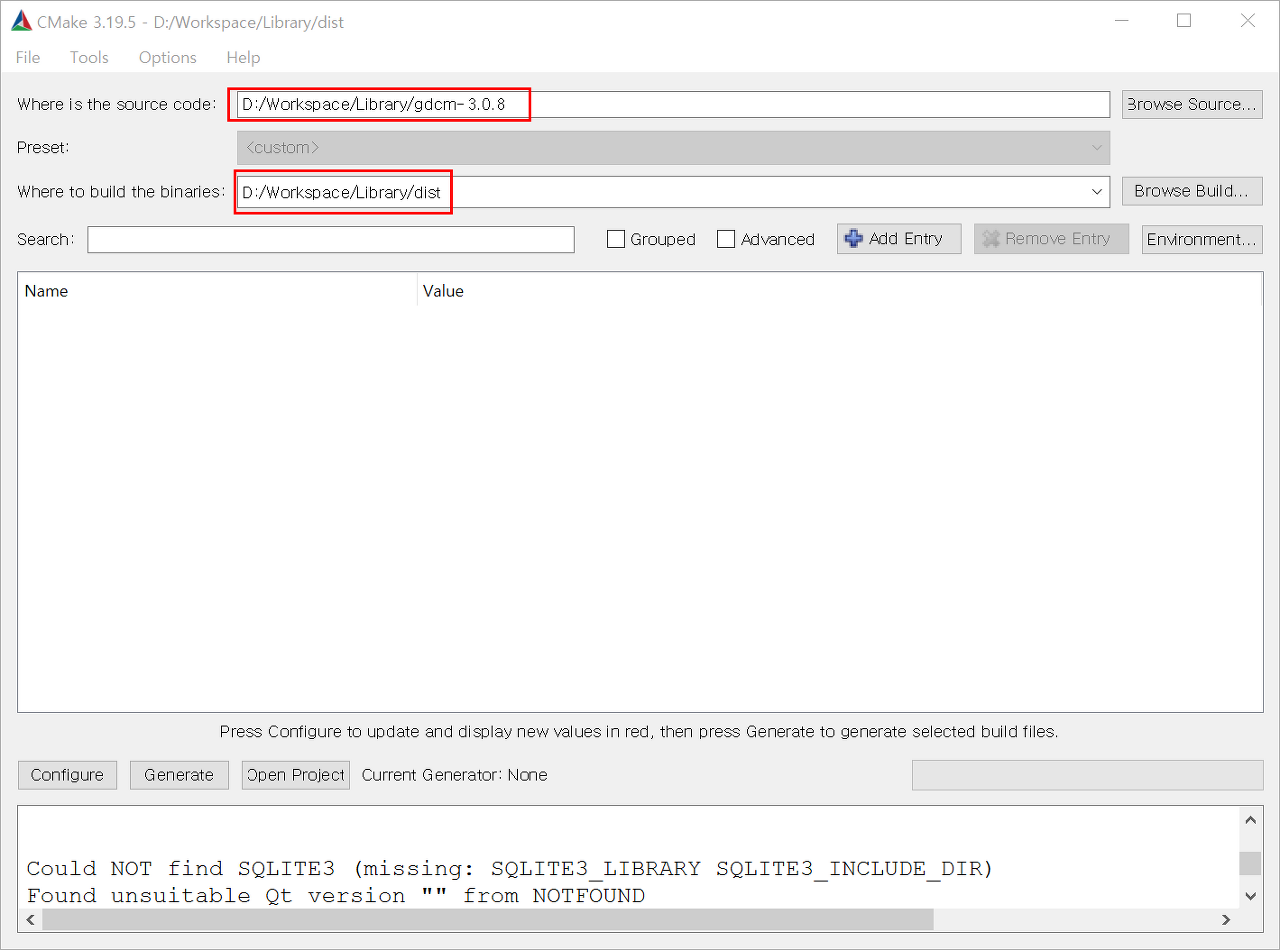 - GDCM 소스코드 경로와 빌드 결과 폴더를 설정한다.